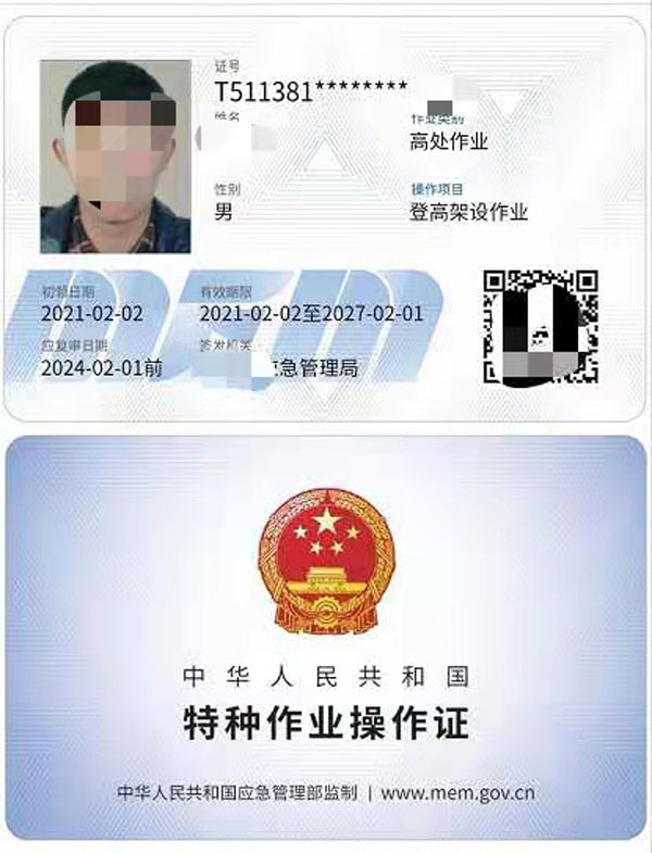 證書適用于利用專用設備進行建筑物內外裝飾、清潔、裝修,電力、電信等線路架設,高處管道架設,小型空調高處安裝、維修,各種設備設施與戶外廣告設施的安裝、檢修、維護以及在高處從事建筑物、設備設施拆除作業。
